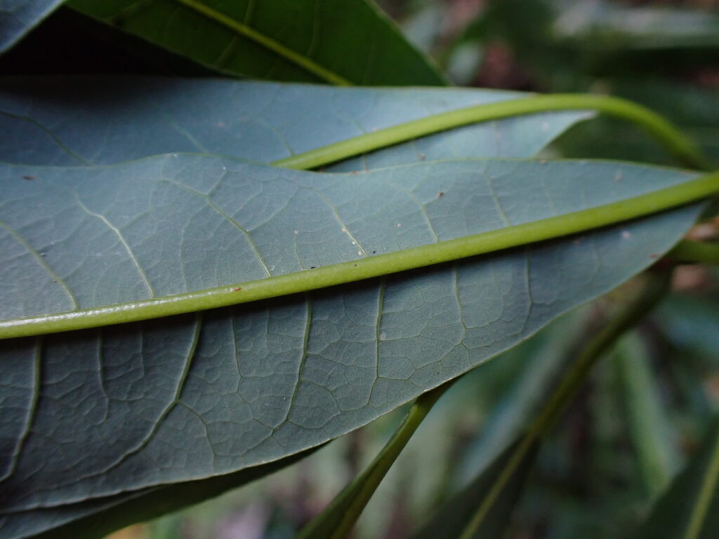 | 葉 | 長披針形で長さ10-15cm・全縁・互生・葉裏の側脈と細脈は隆起 | ||