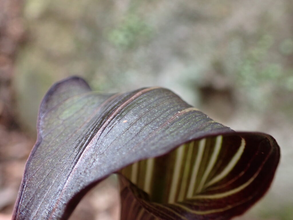 - シコクヒロハテンナンショウ(Arisaema longipedunculatum):花序は葉よりも遅れて展開、偽茎の開口部は花序柄に密着。