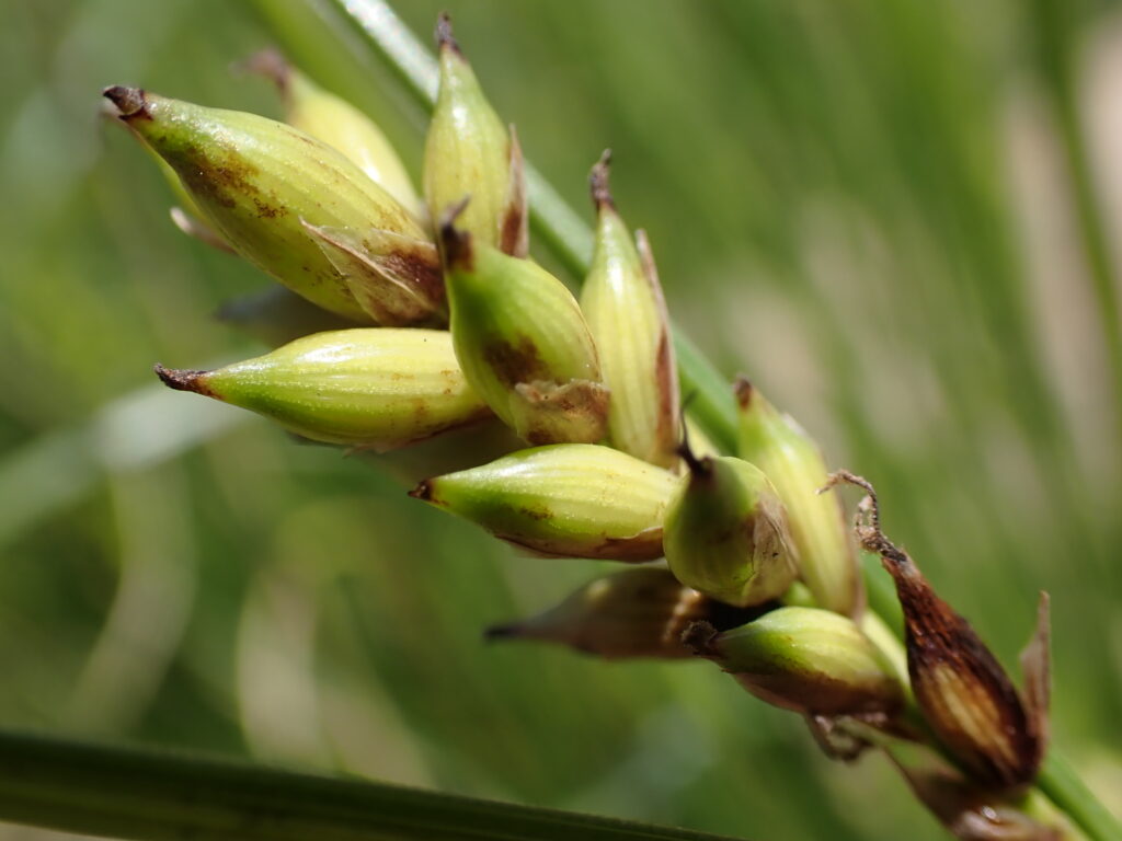 | 花 | 雌小穂は長さ1-2cm、離れてつく・苞は葉状・雌鱗片は淡褐色で中肋は緑色、鋭頭・雄鱗片は黒褐色 | ||