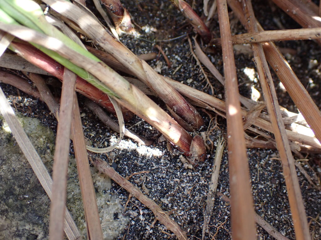 | 葉 | 幅1.5-3.mm・ざらつく・基部の鞘は赤紫色で糸網を生じる | ||