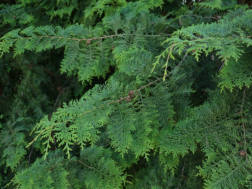- サワラ(Chamaecyparis pisifera):葉裏の気孔群はほぼ全面(X字形)、球果は径5-7mm。(大分県未確認)
