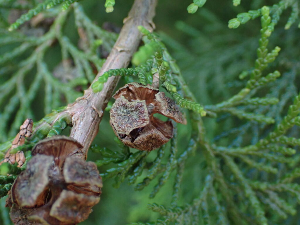 - アスナロ(Thujopsis dolabrata var. dolabrata):葉裏の気孔群は大きい(W字形)、球果は径12-15mm。