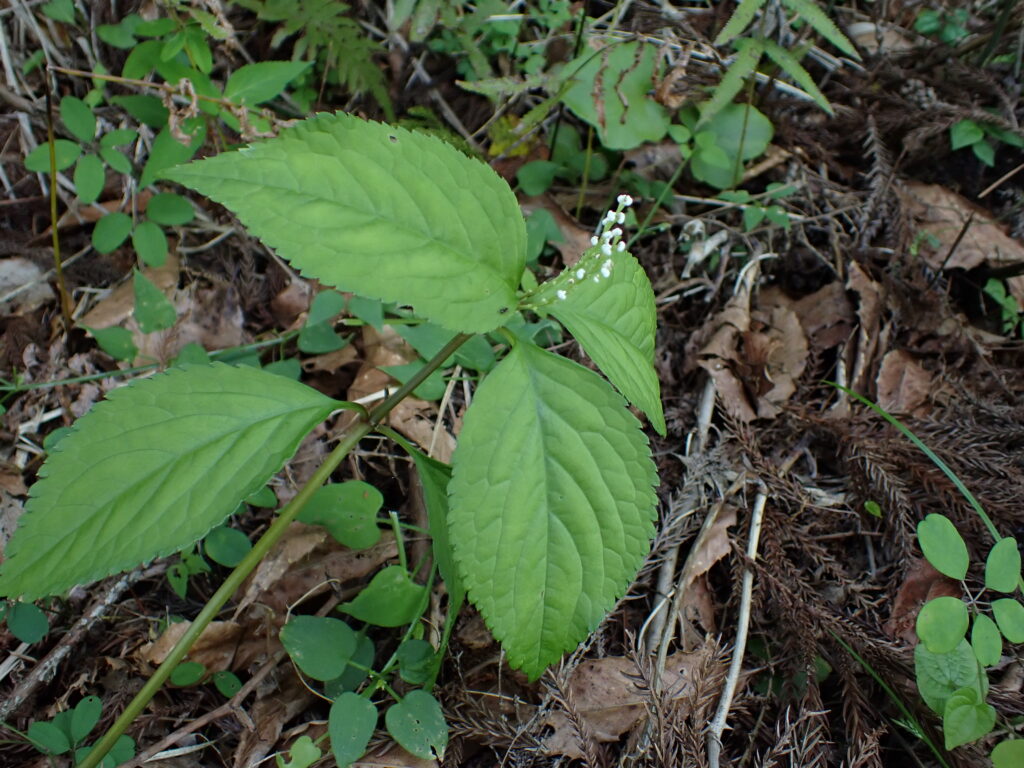 | 葉 | 楕円形~卵状楕円形で長さ5-17cm・鋸歯縁・対生・上部の葉の節間は0.5-2cm | ||