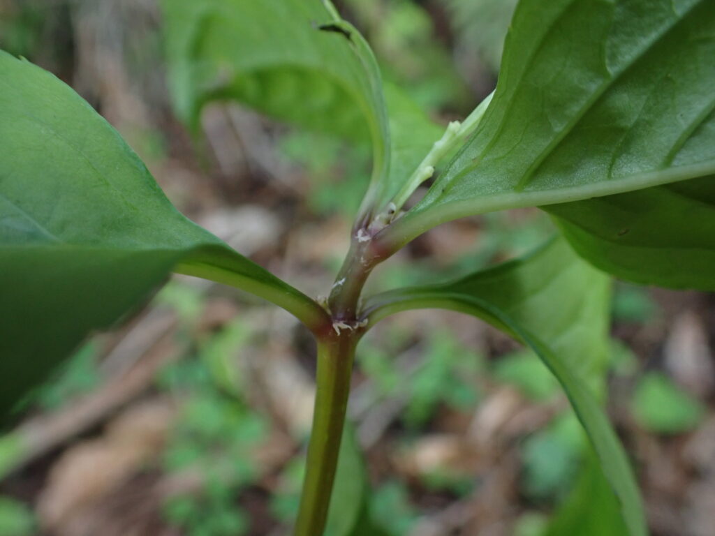 - ヒトリシズカ(Chloranthus quadrifolius):上部の葉の節間はほとんど伸びず、葯隔は長さ3-5mm。