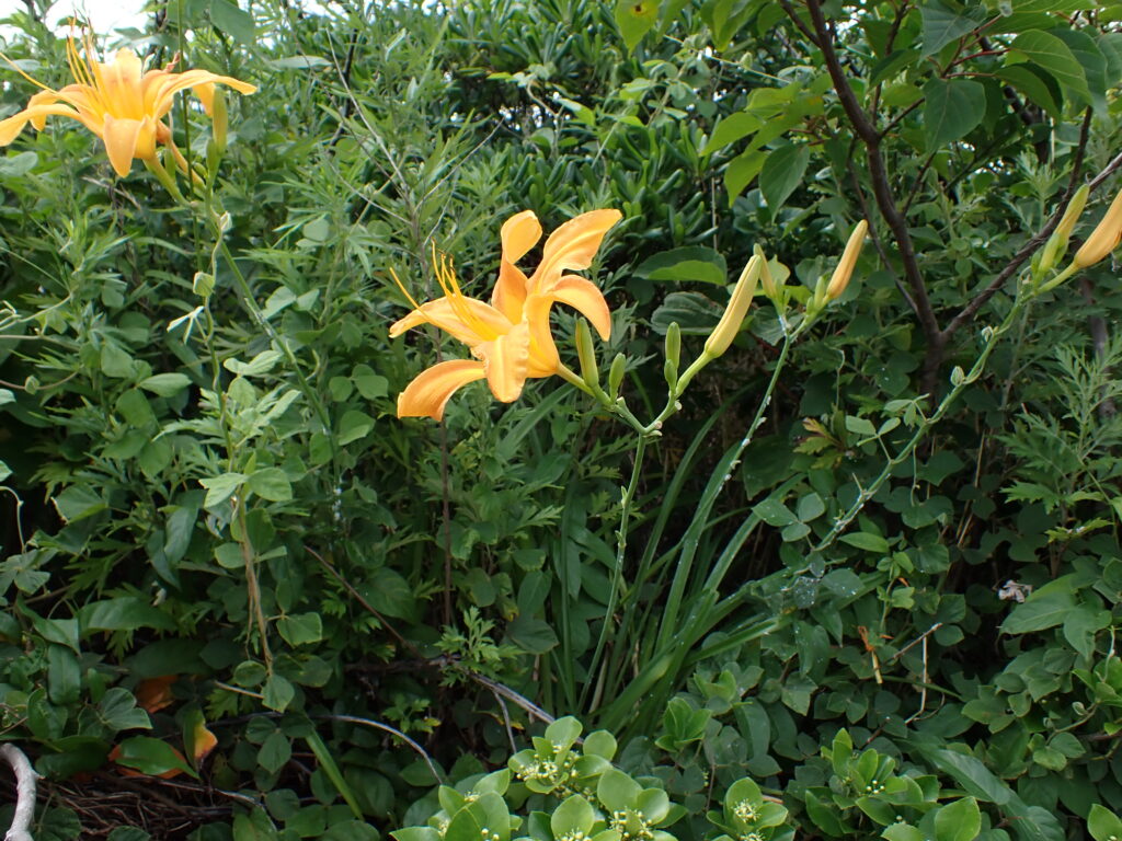 - ノカンゾウ(Hemerocallis fulva var. disticha):葉はやや薄く幅10-15mm、冬に枯れる。