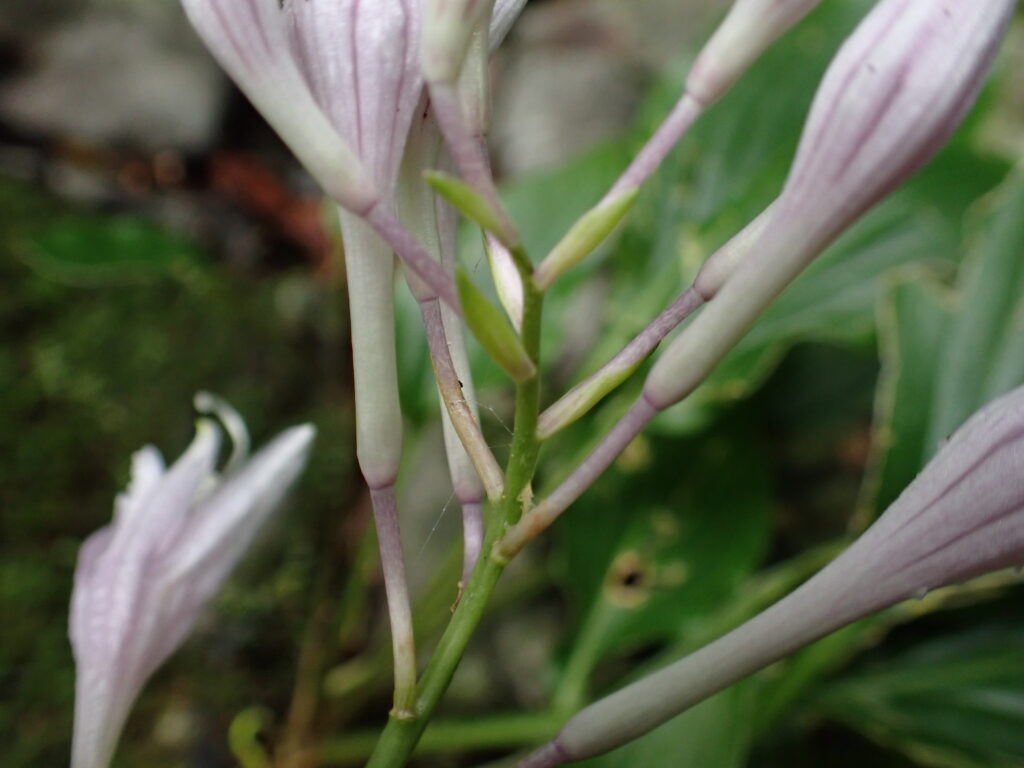 - ウバタケギボウシ(Hosta pulchella):花被内側の脈は濃紫色・葉身は柄に沿って流れない・苞は緑色・葉裏脈上は平滑。