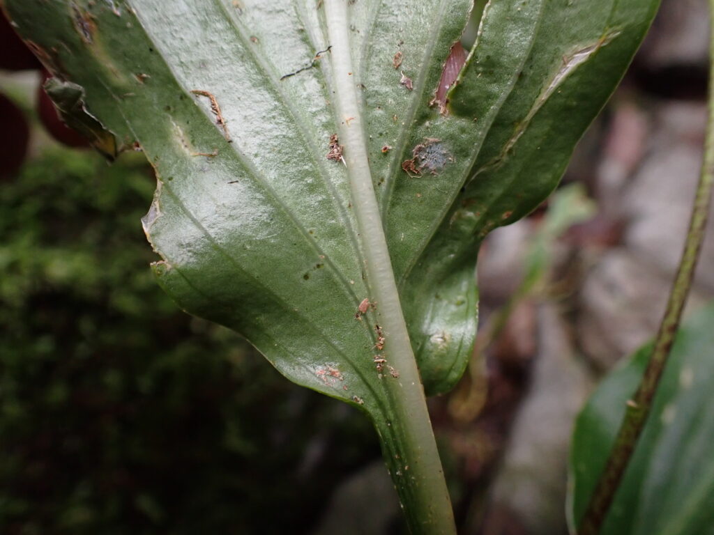 | 葉 | 卵形で長さ10-13cm・基部は心形・葉裏の脈上は平滑・暗緑色で紫黒色の斑点がある | ||