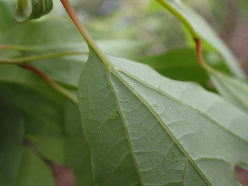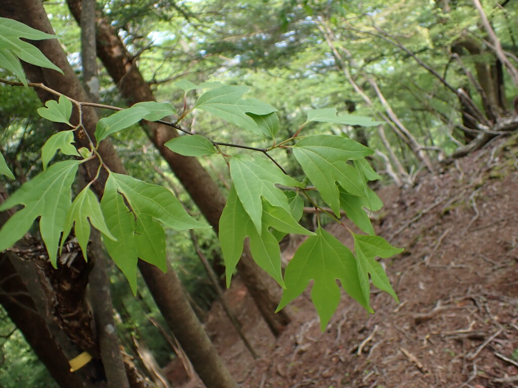 | 葉 | 三角状広倒卵形で長さ7-12cm・全縁・互生・葉先はふつう3中裂 | ||