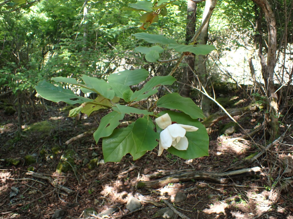- ホオノキ(Magnolia obovata):葉は倒卵形で長さ20-40cm、花は白色で径15cm。