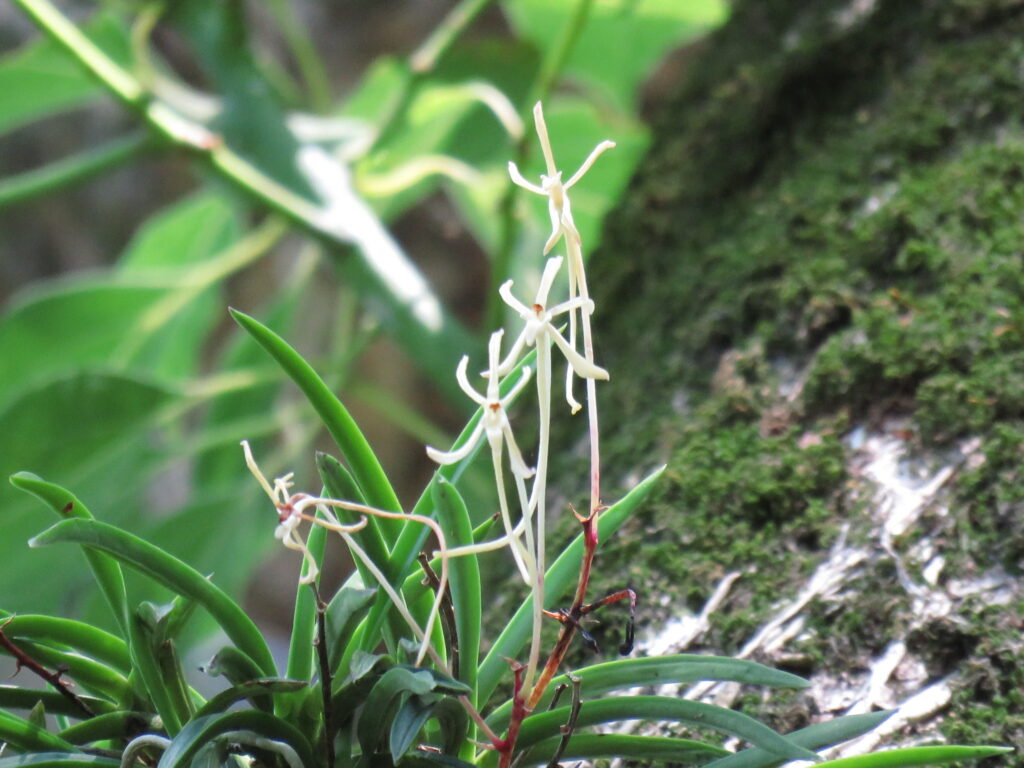 | 花 | 総状花序・白色で3-10個つく・萼片は線状披針形で長さ10mm・唇弁の側裂片は半円形・距は前方に湾曲し長さ4-5cm | ||