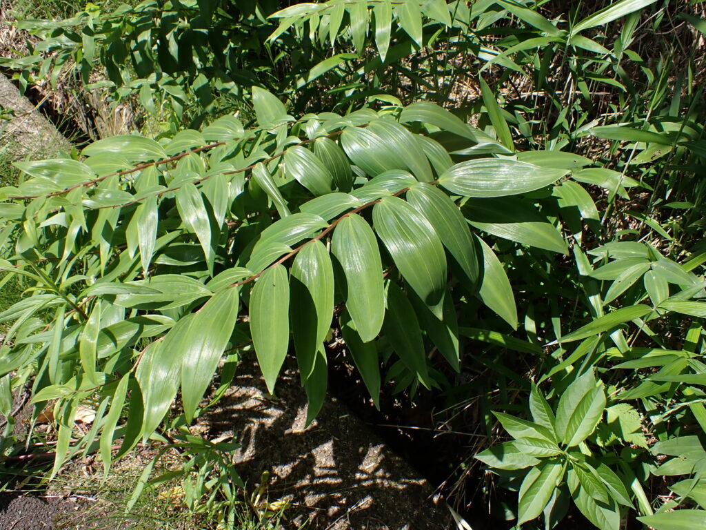 - オオナルコユリ(Polygonatum macranthum):花糸は無毛、茎は円柱形、花は漏斗状鐘形で長さ25-38mm。