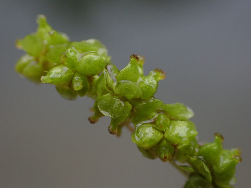 - ミズヒキモ(Potamogeton octandrus var. miduhikimo):果実背面に3稜。